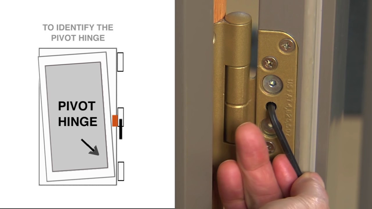 Turn bottom hinge Vertical Adjustment Screw clockwise 1/2 turn and then continue turning until door is centered vertically in opening. Turn next hinge Vertical Adjustment Screw clockwise until door moves slightly, then turn counterclockwise 1/4″ turn. Repeat for remaining hinges working upward.